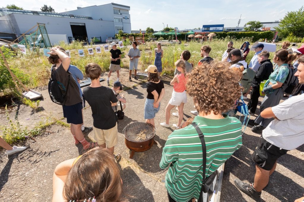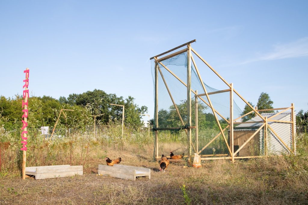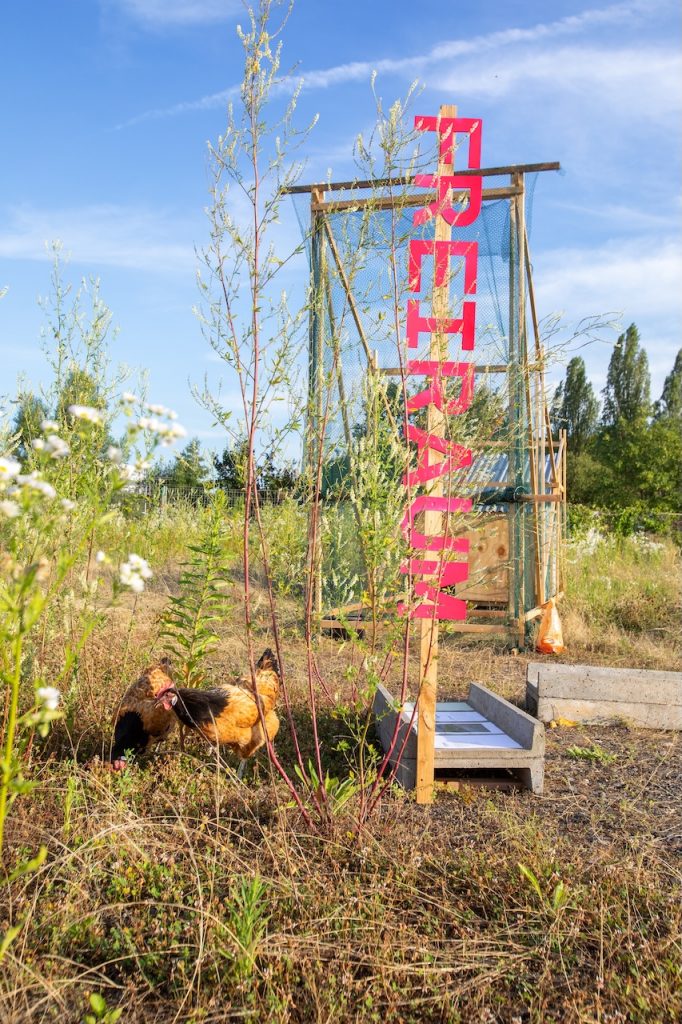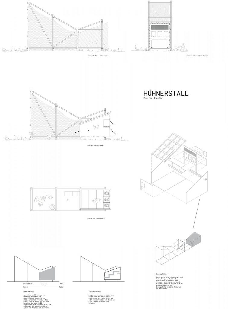 Die spezifische Auseinandersetzung mit dem Ort ist Teil unserer Methodik. Der Ort wird dabei phänomenologisch erschlossen – durch Beobachtung, Dokumentation und Analyse. Ziel ist die Identifikation ortsspezifischer Bedarfe. Die kontinuierliche physische Präsenz ermöglicht eine differenzierte Wahrnehmung atmosphärischer, sozialer und räumlicher Phänomene. Im Rahmen dieser Betrachtung schlüsseln wir verschiedene Handlungsfelder auf dem Areal auf. Das zentrale Handlungsfeld bildet ein ehemaliger Baustoffhof. Die versiegelte Fläche ist dominiert von Leere und Zwischenlagerung, in in der sich Pionierpflanzen sukzessiv die Brache zurückerobern. Kleinunternehmer*innen die in den umliegenden Hallen lagern, finden soziale Begegnungen durch spontane, ungesteuerte Treffen auf der Fläche. Die Reaktivierung dieser brachliegenden Freifläche erfolgte exemplarisch durch die Konzeption, den Bau und Betrieb eines Hühnerstalls. Die Nutzung diente dabei als Katalysator sozialer Interaktion und kollektiver Verantwortungsübernahme. Menschen organisieren untereinander die Obhut für Tiere, tauschen sich aus.