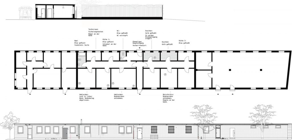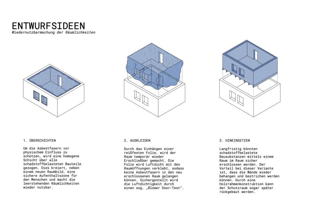 Grundlegend für das methodische Vorgehen war ein suchender Ansatz, der auf Ergebnisoffenheit und Prozessualität basiert. Wesentlicher Bestandteil war die Entwicklung eigener Werkzeuge zur thematischen Annäherung unter Einbeziehung heterogener, teils randständiger Informationen. Die Auseinandersetzung mit einer asbestbelasteten Baracke veranschaulichte diesen Ansatz: Anstelle konventioneller Abrissstrategien wurden alternative Vorgehensweisen entwickelt, um neue Bezüge herzustellen und erweiterte Handlungsspielräume zu generieren.